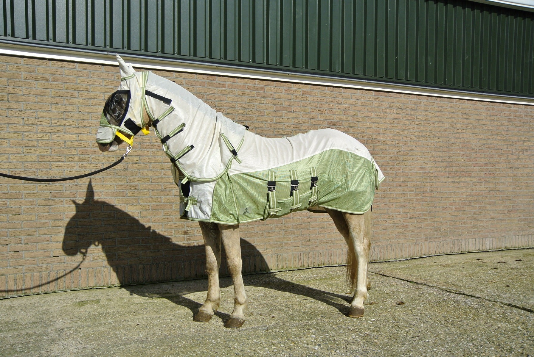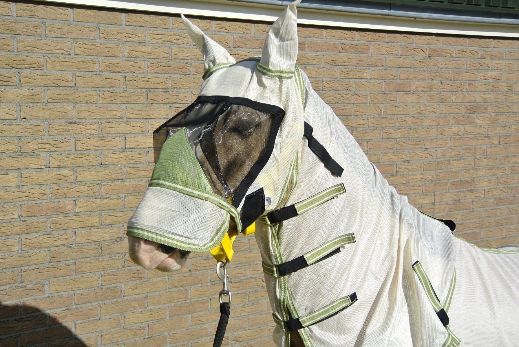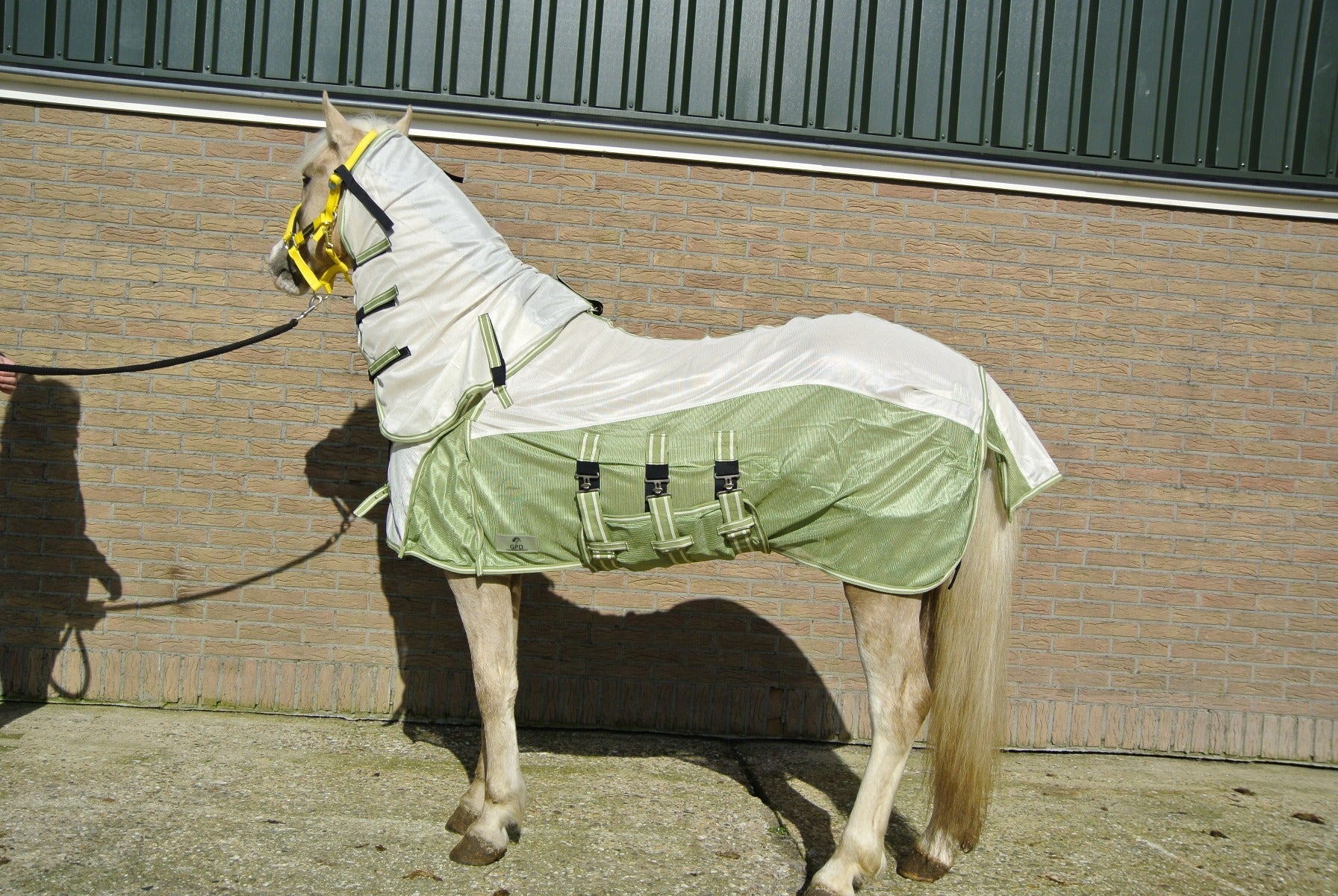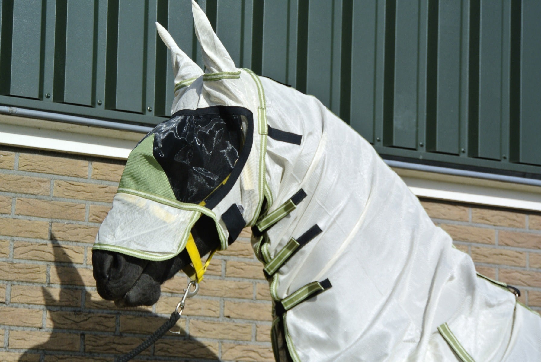 Couverture anti-mouches avec rabat amovible pour le cou et le ventre, comprenant un masque neuf avec une protection nasale, vert/blanc crème