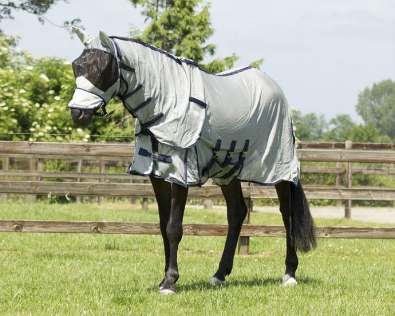 Yn 'e simmermoannen kinne hynders lêst hawwe fan miggen, hynstefliegen, muggen en oare ferfelende ynsekten. Om jo hynder hjir tsjin te beskermjen, biede wy ferskate miggedekens oan, lykas it miggedeken mei nekke en kap. Dit deken hat in ôfneembere nekke en kap, wêrtroch jo se kinne fuortsmite as muggen en ynsekten minder aktyf binne. It deken hat in búkflap dy't goed past en dûbeld fêstmakke is mei klittenband en singels, wêrtroch't it net ferskowe kin.