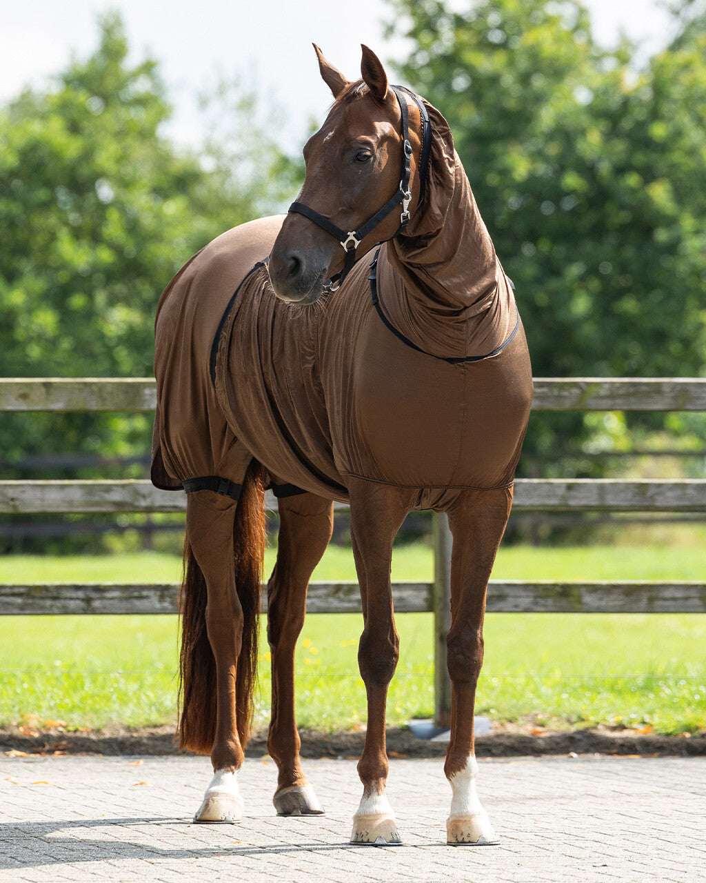 Eczeemdeken waarmee u het paard kunt beschermen tegen beten van de culicoide mug. De eczeemdeken beschermd het paard tegen staart en manen eczeem, ook wel zomereczeem genoemd. Hierdoor wordt de kans op het ontstaan van eczeem veel kleiner. De deken moet in principe 24-uur per dag gedragen worden behalve tijdens het rijden. De deken biedt naast bescherming tegen insecten ook bescherming tegen zonlicht. De eczeemdeken is gemaakt van 100% polyester en heeft plastic fournituren. Het materiaal van de deken is sterk, elastisch, ademend en sneldrogend en is machinewasbaar op 30Β°C. De eczeemdeken heeft een perfecte pasvorm en voorziet in volledige bewegingsvrijheid en is op verschillende manieren vast te zetten en verstelbaar. Maten: 105 t/m 225 Let op! Losse hoofdkap is apart bij te bestellen.