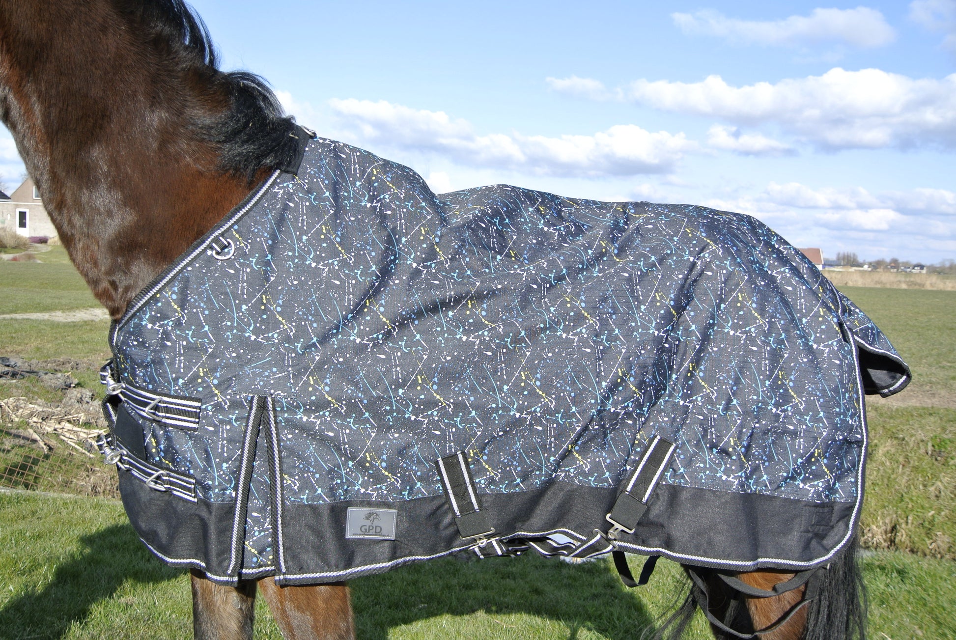 Sterke, waterdichte en ademende paardendeken 0 grams die ervoor zorgt dat een paard bij wind en lage temperaturen warm blijft. De paardendeken heeft een goede pasvorm en is voorzien van ringen bij de hals waaraan een losse hals bevestigd kan worden. Elk seizoen in nieuwe modieuze patronen verkrijgbaar.