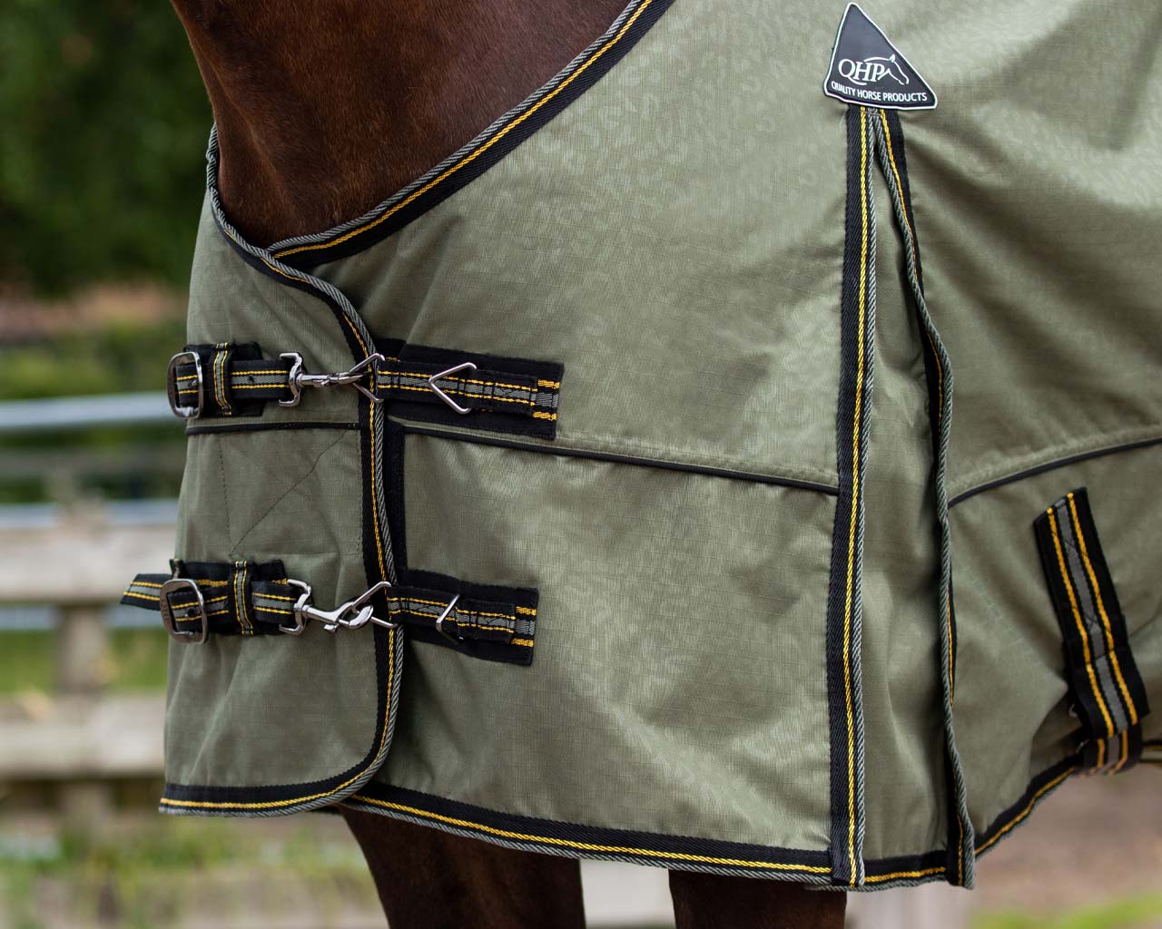 Meer Informatie Sterke, waterdichte en ademende paardendeken zonder voering die ervoor zorgt dat een paard droog blijft en beschermd is tegen wind. De deken heeft een goede pasvorm en is voorzien van ringen bij de hals, waaraan een losse hals bevestigd kan worden. Details: Stofsamenstelling buitenkant: 100% polyester Stofsamenstelling binnenkant: 65% polyester, 35% katoen Regendeken van 600D, 3000/3000 ripstop turnout stof Ongevoerde deken Waterdicht en ademend Voorzien van dubbele snelsluiting aan de voorzijde D-Ringen voor de bevestiging van een losse hals Voorzien van gesatineerde RVS fournituren Zachte fleece inzet op de schoft Met kruissingels met elastiek aan het uiteinde Voorzien van loopsplitten elastische bilkoorden staartkoord Extra grote staartflap
